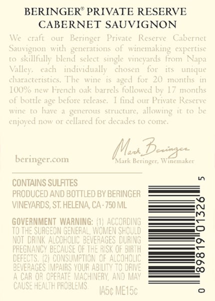 Beringer Private Reserve Cabernet Sauvignon 2014 presenterar sig intensivt björnbärsröd med svart kärna och lila kant... Doften lovar en sexig Napa Cab från översta hyllan med legendarisk doft av torkad viol, cassis, choklad, espresso, mineralisk skogsbotten, cederträ, engelsk lakrits, mynta, svarta körsbär, plommon och läder... I munnen imponerar Caberneten omedelbart med sin silkeslena textur, medan smaken tar hem segern med stor kraft, elegant finess och unik kryddig komplexitet. Eftersmaken osar närmast av lyxklass, med perfekt integrerade fatkryddor som fortsätter att bjuda på nya lager av komplex välsmak fram i ljuset... Oförglömligt amerikanskt rött vin! Drick nu, eller lagra 25+ år från skördeåret.