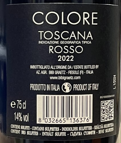 Colore 2021 är gjort på 100% Sangiovese som Bibi Graetz väljer ut från 70, 80 och 90 år gamla Sangiovese-vinstockar från Bibis fyra bästa vingårdar i Lamole, Vincigliata, Olmo respektive Siena. För att säkerställa att varje druva väljs ut vid optimal mognad skördar Bibi varje terroir i upp till 8 omgångar (!)
