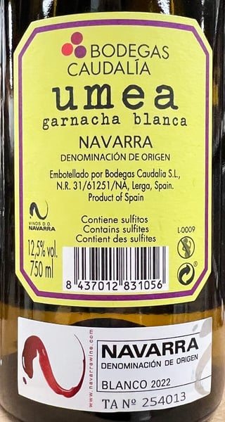 Vinet är gjort på 100% Grenache Blanc (Garnacha Blanca), som den lilla vingården Bodegas Caudalia väljer från fält runt byn San Martín de Unx i Navarras Baja Montaña-zon. Vinet jäses i ståltankar för att bibehålla den friska och druvliknande stilen. 20% av vinet lagras på 500 liters ekfat för att ge rätt mängd komplexitet till smaken utan att dominera fruktsmakerna.