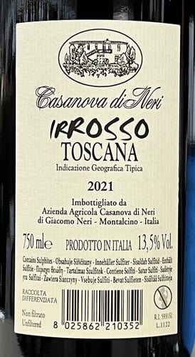 Irrosso 2021 är gjord av 90% Sangiovese, subtilt förstärkt med djup smak och komplexitet från 5% Cabernet Sauvignon och 5% Petit Verdot, handskördad av Casanova di Neri från samma södra Cetine-fält som levererar frukt till den berömda 100-poäng Brunello Tenuta Nuova! Irrosso spontanjäses med bästa terroir- och källarjäst innan 15 månaders lagring på ekfat.