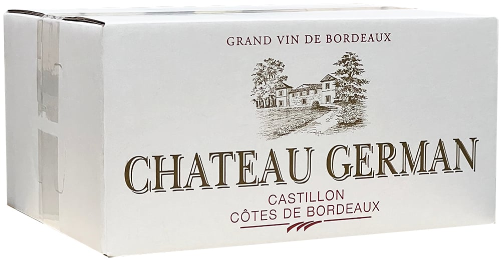 Druvorna till Chateau German 2018 skördas från fält i AOC Castillion, som gränsar till det berömda St-Émilion. Vinet är gjort av en blandning av 70% Merlot, 20% Cabernet Sauvignon och 10% Cabernet Franc. Vinrankorna är mellan 35 och 40 år gamla och planterade i en sandjord med ler- och järnunderlag. Druvorna väljs noggrant ut i vingården liksom på vingården, där musten genomgår jäsning i temperaturkontrollerade ståltankar vid cirka 28 grader. Efter jäsningen lagras vinet i 12-24 månader i neutrala tankar för en fruktig och autentisk representation av druvsorterna och terroiren.