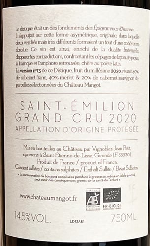Recensioner av Chateau Mangot Saint-Emilion Grand Cru Todeschini Distique 2020 ØKO i trækasse