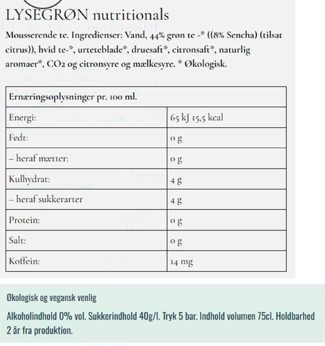 Färgen är klar med gröna nyanser, och LYSEGRØN har liksom de övriga mousserande teerna fina pärlande bubblor.