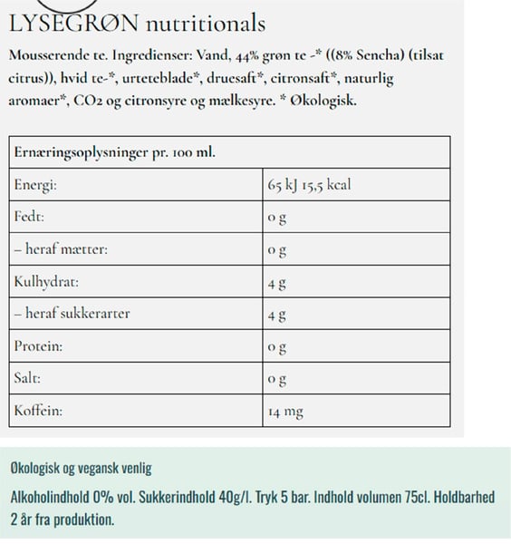”Målet med LYSEGRØN var at ramme en smagsprofil, der leder tankerne hen imod de noter, man kender hos en brut champagne. Vi ønskede at tilføje en tredje variation til vores alkoholfrie sortiment, hvor vi allerede har en tør (LYSERØD) og en blomstrende (BLÅ) variant. LYSEGRØN adskiller sig fra de to andre ved at være mere klassisk og citrus-frisk og er lavet til at matche retter som fisk, østers, kaviar og skaldyr,” forklarer Jacob Kocemba, sommelier og stifter af Copenhagen Sparkling Tea Company, om tankerne bag den nye Sparkling Tea LYSEGRØN.
