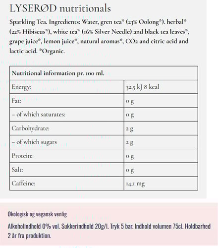 LYSERØD är blandad av endast de bästa ekologiska teerna och innehåller 11 olika teer, inklusive Silver Needle, Oolong, Hibiscus och andra delikata teer. De bryggs av grundarna Jacob och Bo och bryggs med mycket exakta tidsintervaller och temperaturer, eftersom bara en minut för lång tid kan förstöra hela batchen. Efter bryggningen tillsätts färskpressad citronsaft och en ekologisk druvmust för att avrunda teets fyllighet och smak, vilket ger ett restsocker på 20 g/l. Teet tappas på flaska vid cirka 5,5 bar och vilar i 8-12 veckor innan det slutligen släpps.