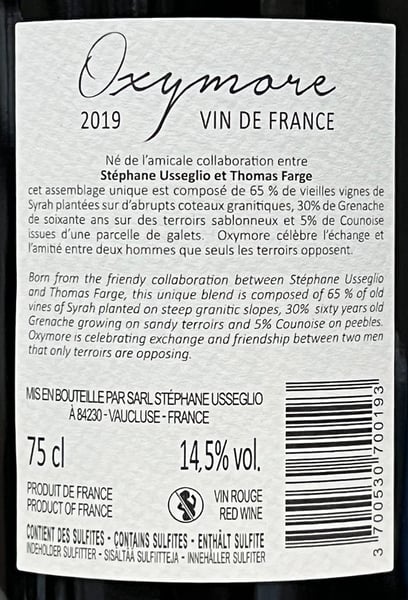 Oxymore 2019 är första årgången av ett unikt samarbete mellan Domaine Raymond Usseglio från Châteauneuf-du-Pape och Domaine Guy Farge i Saint-Joseph. Kultproducenterna skapar sitt gemensamma vin på toppdruvor från mer än 60 år gamla vinstockar!