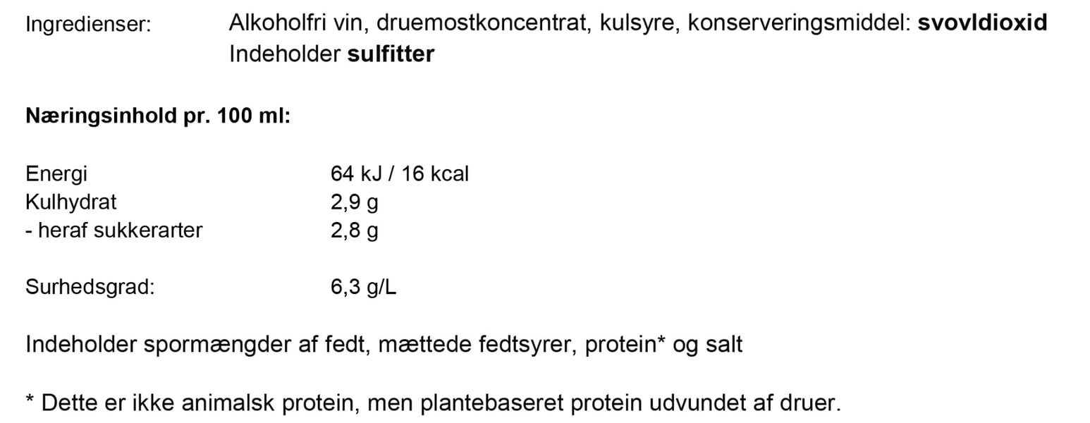 Ingredienser: Avalkoholiserat vin, rektificerad koncentrerad druvmust, koldioxid, konserveringsmedel: svaveldioxid.