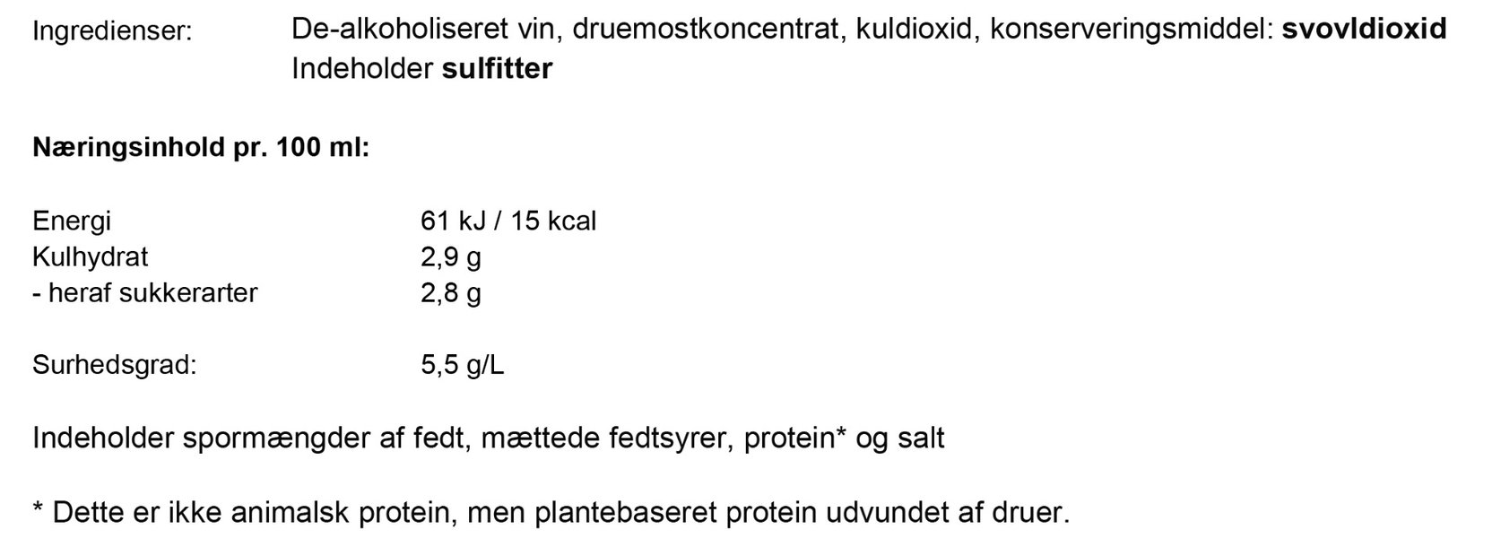 Ingredienser: Avalkoholiserat vin, sackaros, koldioxid, konserveringsmedel: Svaveldioxid