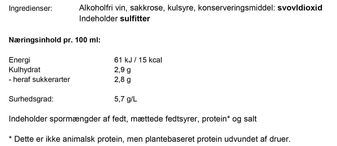 Ingredienser: Avalkoholiserat vin, sackaros, koldioxid, konserveringsmedel: Svaveldioxid