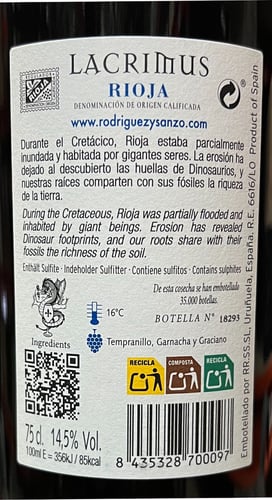 Lacrimus 2021 presenterar sig med en mörk plommonröd färg... Näsan följer upp med stor frukt och kryddiga klassiska aromer av svarta körsbär, mogna björnbär, örter, åldrad balsamico, lakrits, kaffe, rök och vanilj ... I gommen är det mjukt och balanserat med lyxiga fatkryddor som smeker den djupa och saftiga bärfrukten. Kryddiga örter och frisk underliggande mineralitet ger elegans till gommen, med silkeslena tanniner och komplexa toner av läder, mokka och vanilj. Topp Rioja! Drick nu eller spara 8-10 år från skördeåret.