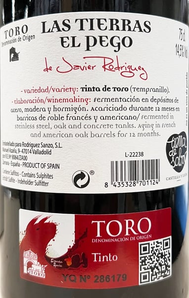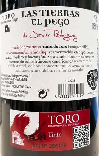 Vinet är gjort på 100% Tempranillo (lokalt känt som Tinta de Toro), som Javier Rodriguez handplockar från 45-60 år gamla buskvinstockar på familjens egen sandiga och grusiga terroir runt byn El Pego på 720 meters höjd. I källaren går Javier till ytterligheter i sin jakt på den perfekta blandningen av frukt och kryddor. Han håller druvorna fräscha med torris och jäser en del av musten med fruktbevarande temperaturkontroll i ståltankar, medan resten berikas med stor komplexitet genom jäsning på franska ekfat. El Pego avslutas med 12 månaders lagring på 2-3 år gamla franska och amerikanska barriquer.