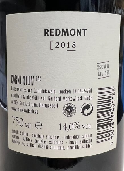 Redmont 2018 är gjord av en blandning av 55% Zweigelt, 25% Blaufränkisch och 20% Merlot från den grus- och järnrika enskilda vingården Rothenberg. Druvorna skördas för hand i flera omgångar. Musten jäser spontant vid 30-32°C med 14 dagars maceration av druvskalen. Vinet mognar i 16 månader på små franska ekfat.