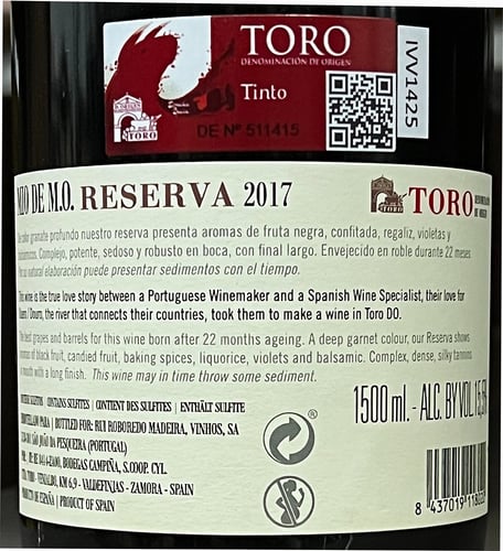 MIO de M.O. Toro Reserva 2017 är gjord på 100% Tempranillo, som den berömde portugisiske vinmakaren Rui Roboredo Madeira har skapat av de bästa handskördade druvorna från en sandig och stenig enskild vingård med 60 år gamla vinstockar som överlevt den fruktade vinlusen phylloxera. Musten jäser i en temperaturkontrollerad ståltank med ett långvarigt uttag av färg, smak och tanniner från druvskalen. Vinet får extra smakdjup och elegant kryddighet genom 22 månaders lagring på ekfat.