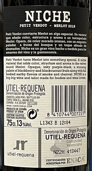 Niche de Torre Oria Petit Verdot Merlot Valencia 2018
