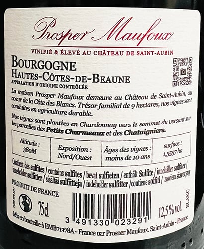 Vinhuset grundades 1860 och förblev 130 år i Maufoux-familjens händer. Sedan 2010 har Prosper Maufoux drivits av den ambitiösa Piffault-familjen, som redan står bakom Bourgognes största Crémant de Bourgogne-märke, Veuve Ambal. Sedan dess har kvaliteten exploderat… År 2015 köpte Piffault-familjen det idylliska Château de Saint-Aubin (inklusive toppmarker i Meursault och Criots-Bâtard-Montrachet!), och slottet har sedan 2020 fungerat som Prosper Maufouxs huvudkontor.