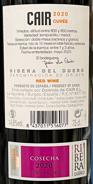 Cair Cuvée är tillverkat av 85% Tempranillo, kompletterat med 15% Merlot. Druvorna skördas i byarna "La Aguilera" och "Moradillo de Roa", där vingårdarna är svala och ligger upp till 960 meter över havet. Vattenreserverna i de gamla vingårdarna i kombination med de många höjdmetrarna gör att druvorna mognar långsamt, vilket ger perfekt balans och aromatisk komplexitet i vinet.